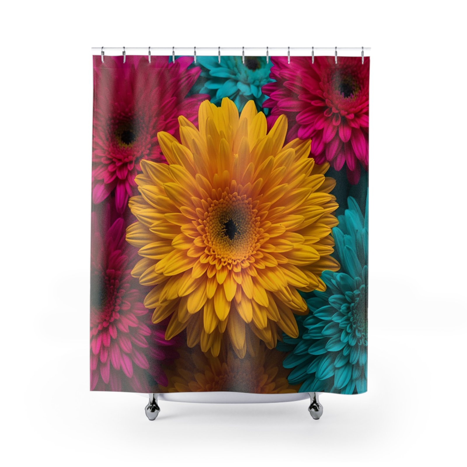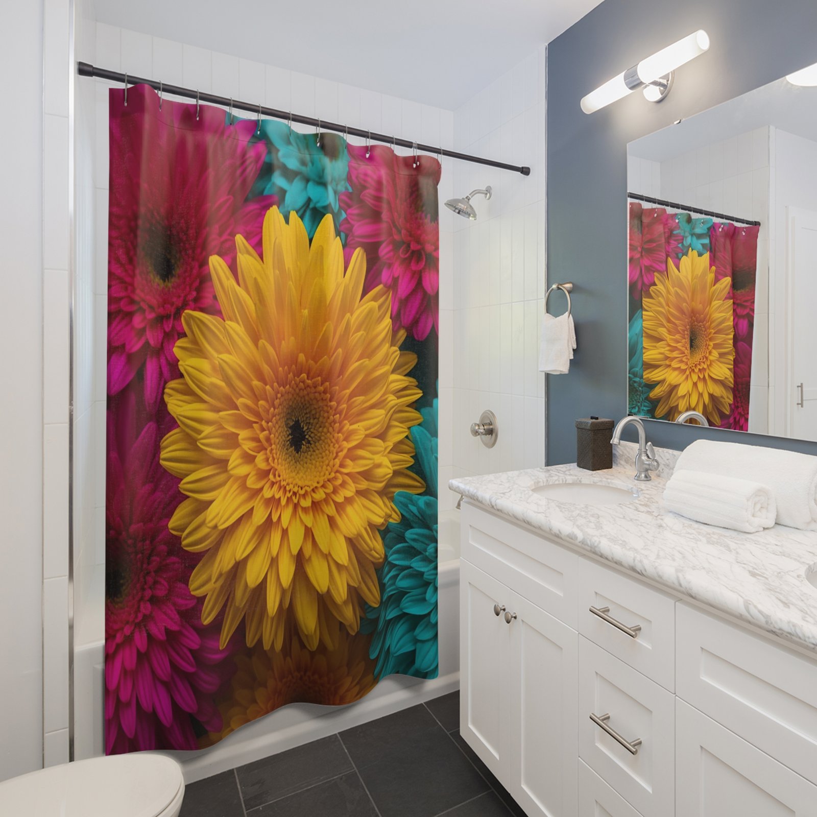 Transform your bathroom into a vibrant oasis with this stunning shower curtain. Featuring a burst of colorful daisies, this floral design brings an atmosphere of cheerfulness and warmth to any space. Perfect for creating a fresh, inviting vibe, it suits a range of personal styles—be it modern, bohemian, or classic. This shower curtain is not only practical but also an aesthetic upgrade for your daily routine.