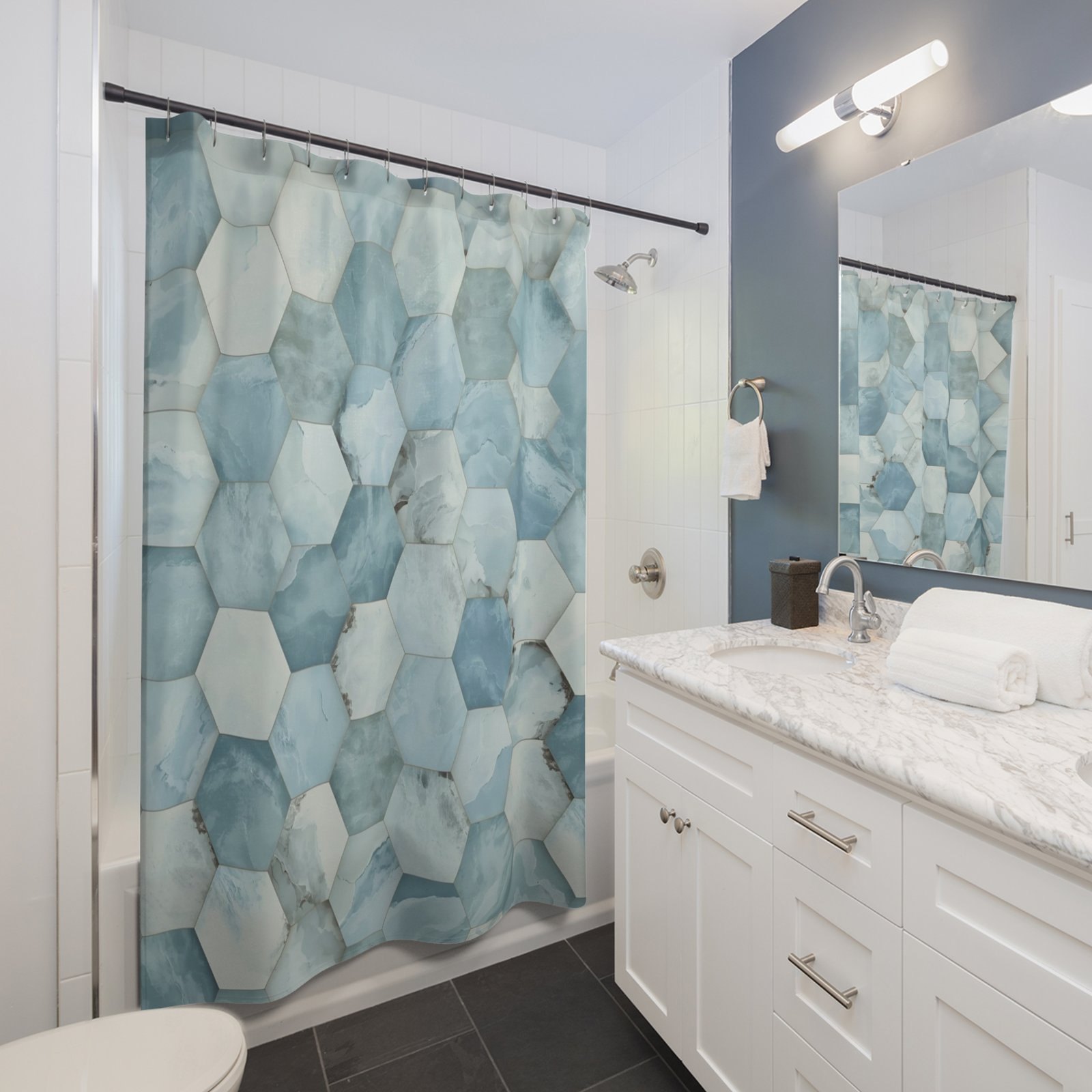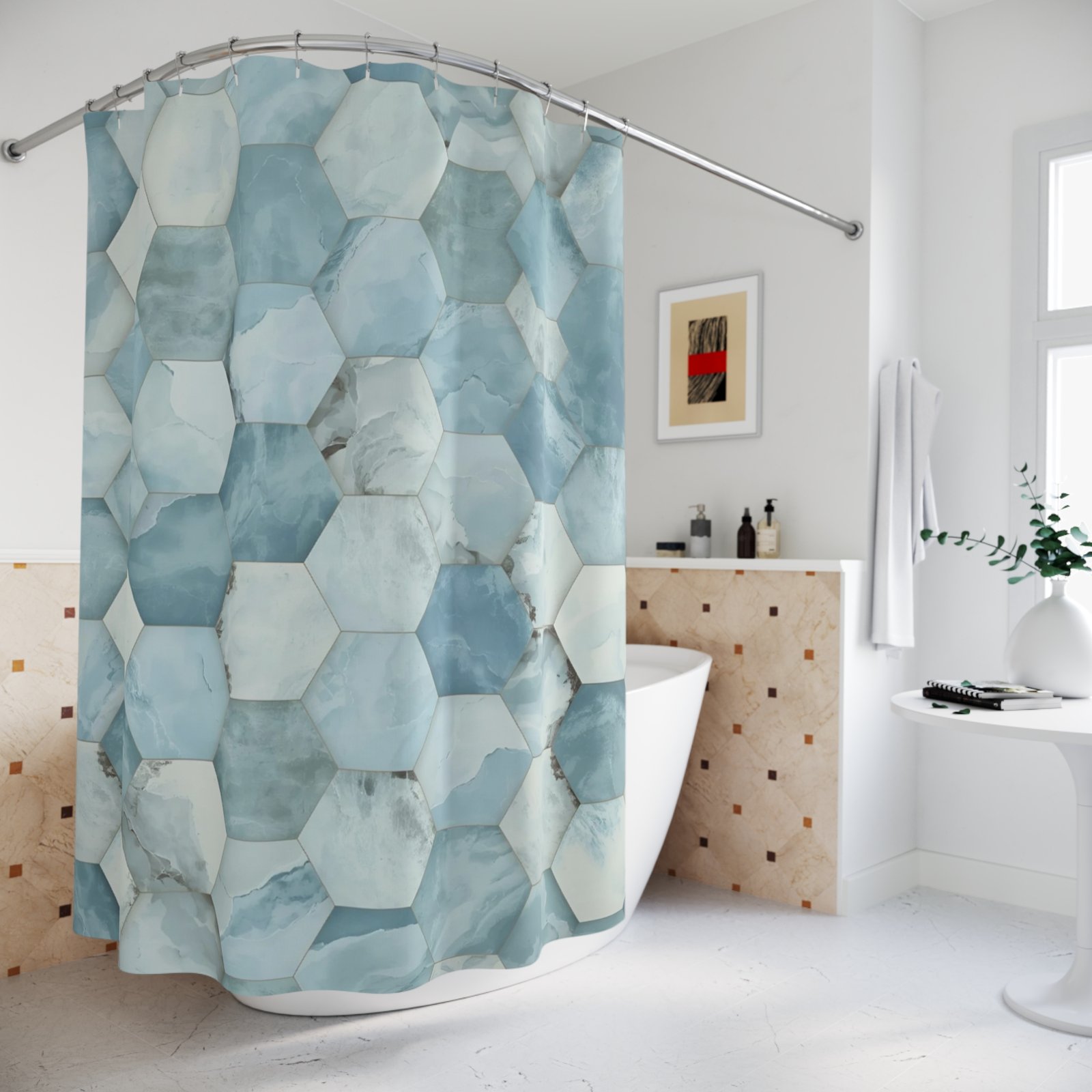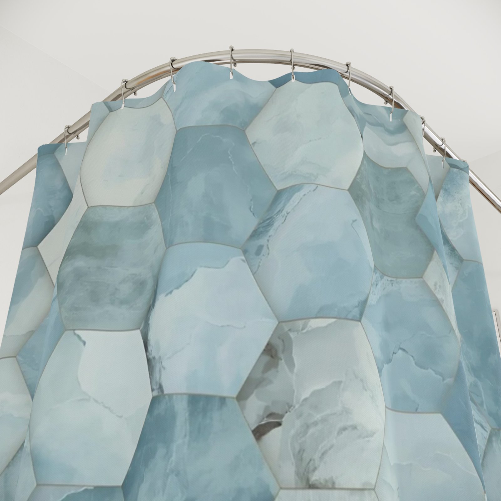 Transform your bathroom into a serene sanctuary with this stunning shower curtain. The elegant design features a beautiful hexagonal pattern in soothing shades of blue, bringing a calm and refreshing vibe to your space. Perfect for individuals looking to elevate their home decor, this shower curtain seamlessly fits into any modern or coastal-themed bathroom. Ideal for housewarming gifts, redecorating, or personal luxury, it makes a thoughtful addition for occasions like birthdays, anniversaries, or holidays. Enjoy a daily spa-like experience with this chic accessory that adds style and tranquility to your routine.
