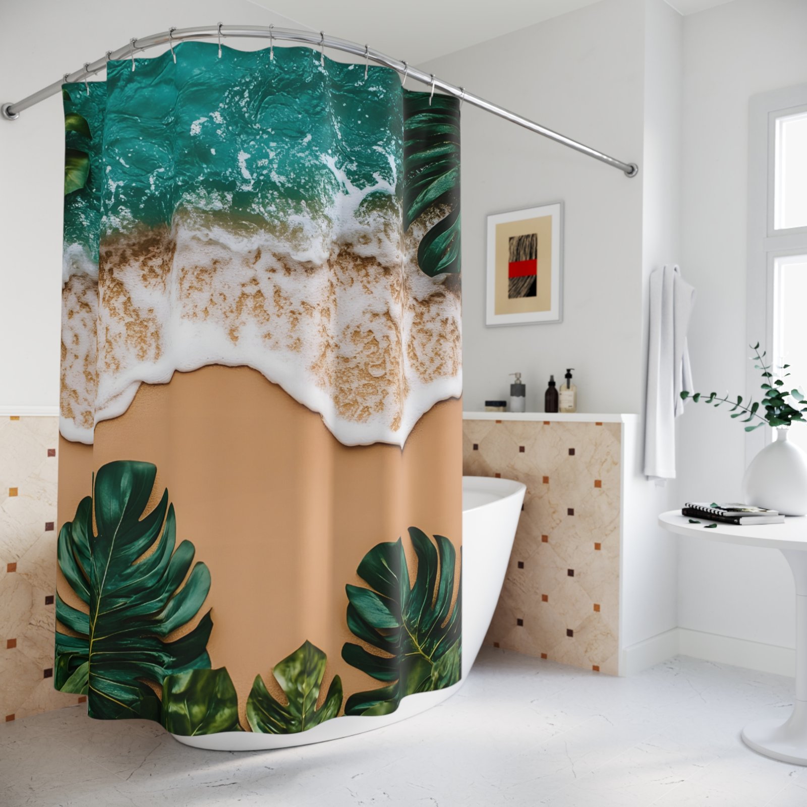 Transform your bathroom into a serene oasis with this stunning shower curtain. Featuring a vibrant print of tropical leaves and a beachy scene, it brings a refreshing vibe to your space. Made from durable 100% polyester, this shower curtain is not only practical but adds a touch of elegance to your home. Perfect for those who love a tropical aesthetic, it’s also an ideal gift for beach lovers and nature enthusiasts. This product is suitable for everyday use, making it a great choice for personal use or as a thoughtful gift during holidays, housewarming celebrations, or to simply brighten someone’s day.