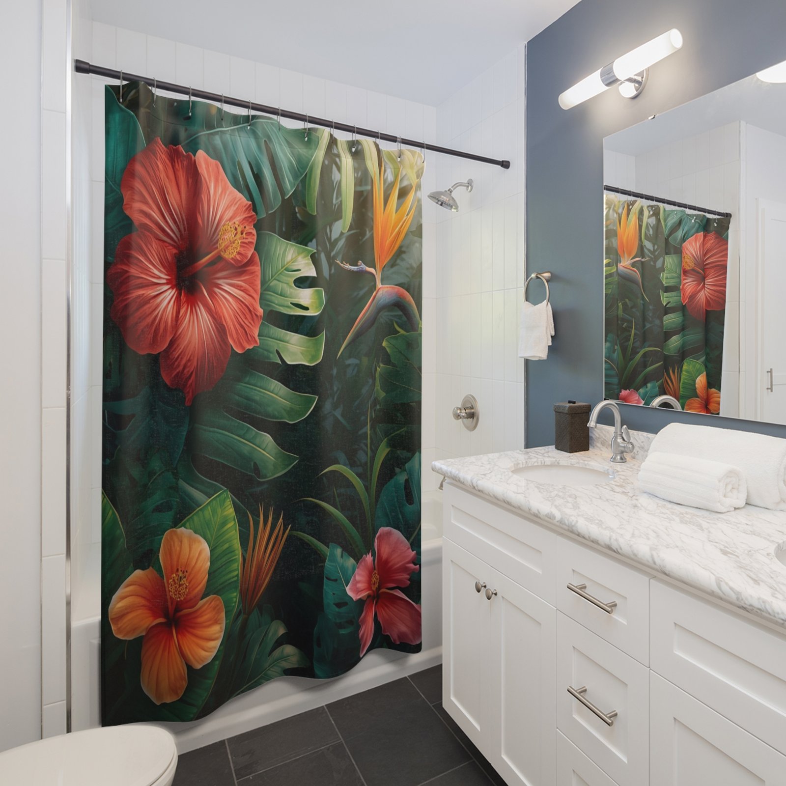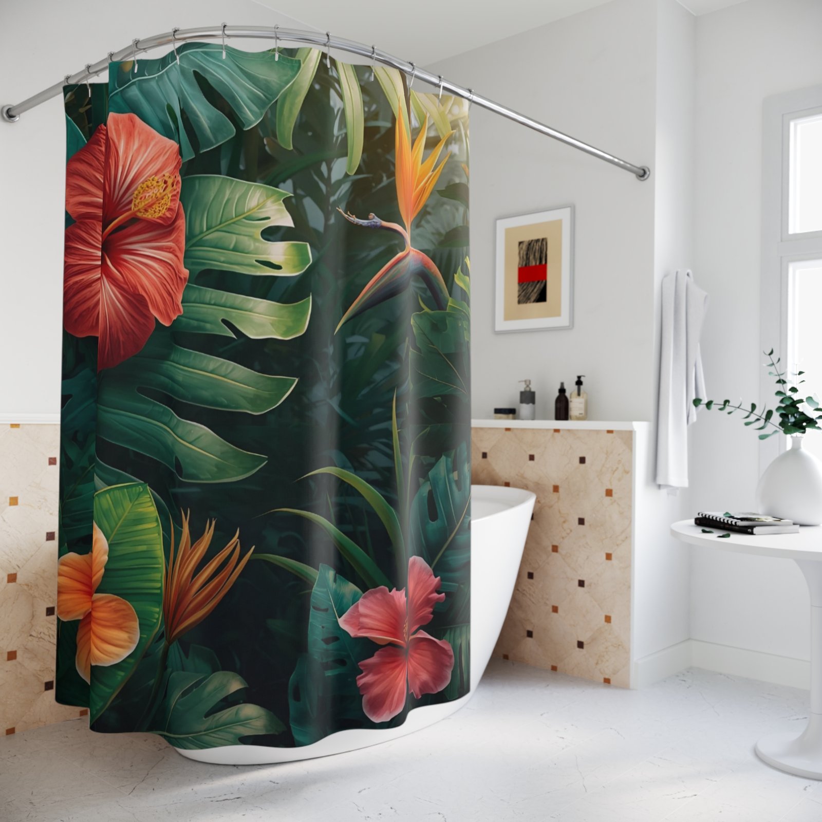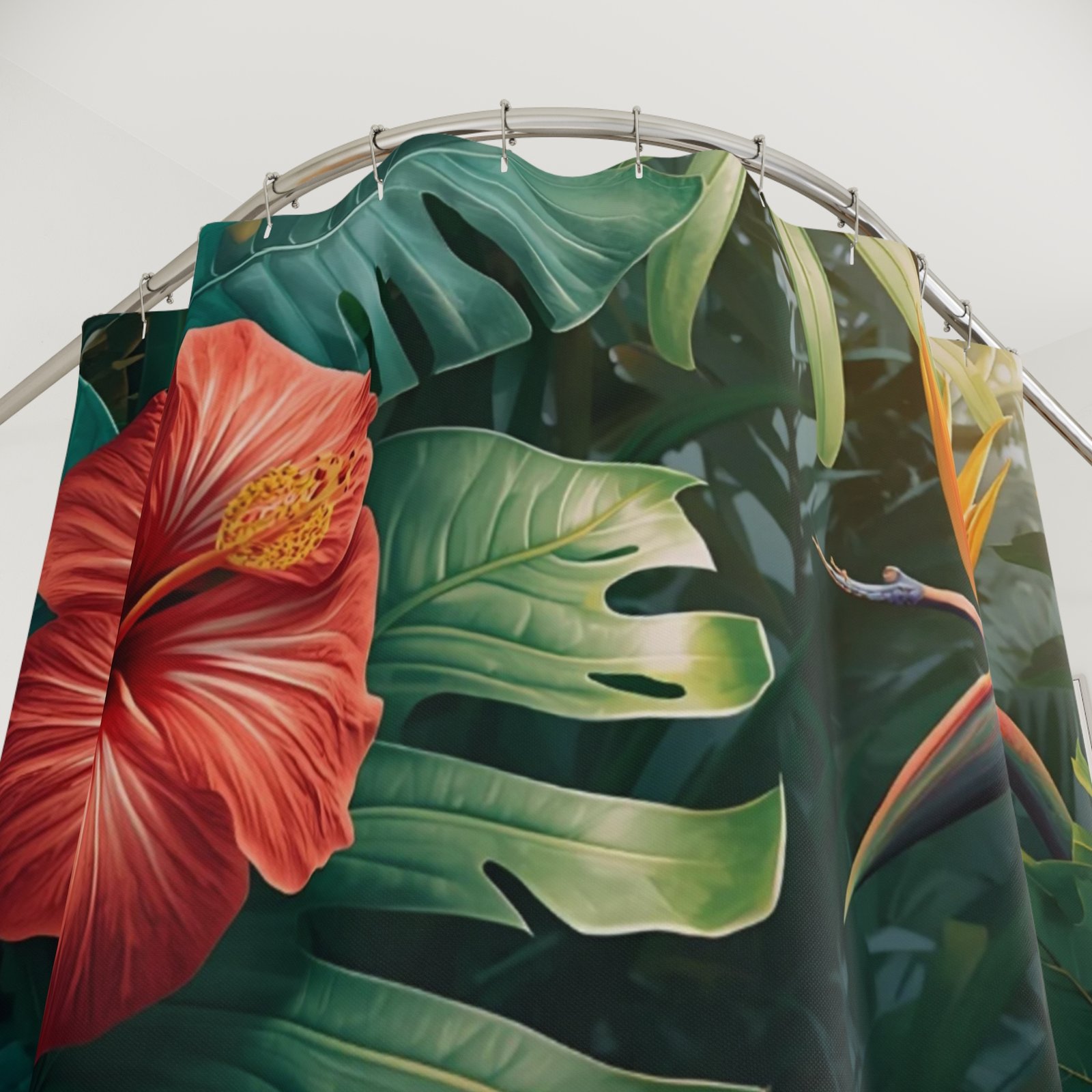 Transform your bathroom into a lush oasis with this vibrant shower curtain. Its beautiful floral design evokes a tropical atmosphere, bringing the beauty of nature right into your space. Perfect for those who appreciate bold and unique home decor, this shower curtain can effortlessly fit into any modern or bohemian bathroom. Ideal for adults looking to refresh their home aesthetics, it acts as a stunning focal point during gatherings or quiet moments of self-care. This product is a fantastic gift for housewarmings, weddings, or any celebration where someone deserves a thoughtful touch. Bring a festive vibe to occasions like summer parties or simply enjoy its beauty every day.